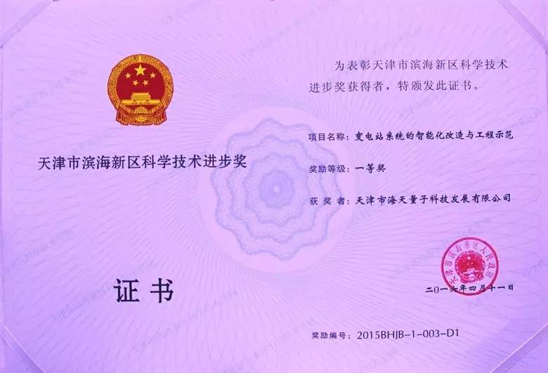 2015年度,天津市共有199项科技成果获奖,其中由我集团下属全资子公司“天津市海天量子科技发展有限公司”申报的《变电站系统的智能化改造与工程示范》项目喜获天津市科学技术进步二等奖滨海新区科学技术进步一等奖